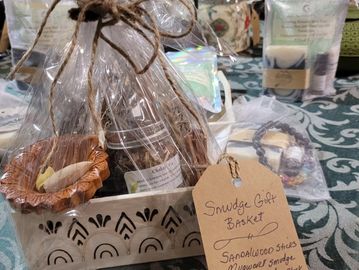 cute gift baskets with a tea sampler, several incenses incense burner and sages, palo santos and smudge sticks for smudging